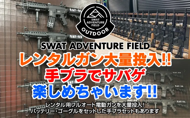 SWAT サバイバルゲーム S.A.F.1980年創業のSWATサバイバルゲーム!専用フィールドS.A.F.で完全復活! 2019年 9月より休止しておりましたサバイバルゲームですが、この度専用フィールド「SWAT ADVENTURE FIELD(S.A.F.)」をご用意して完全復活しました 福岡市内早良区小笠木の山中に 48,000平方メートルの敷地面積に市内唯一の ・森林サバゲエリア・CQBエリアキッズエリア・BBQ・デイキャンプ等 充実の施設を持つフィールドです! ご参加には会員のご登録が必要です(登録料、年会費等は無料です) 登録会員の皆様にはSWAT=S.A.F.でスポーツ保険に加入していますので、安心安全にアウトドアスポーツをお楽しみいただけます。 新規会員登録をご希望の方は新規会員登録専用フォームからお申込いただくか、SWAT荒江本店店頭でも受付けております。 毎週日曜日、サバゲ定例会開催。平日貸切サバゲ等随時ご予約受付中です! 未登録の方で参加希望日が決まっていましたら【会員登録】後、専用ご予約ページからご希望の日程を選んでご予約ください。 店頭割引特典付きスタンプカード会員証を発行致します。 SWAT=S.A.F.でご参加をお待ちしております!! ※旧会員様も新規会員登録が必要です 旧会員番号はご使用頂けません ※未成年者のゲームご参加には保護者の承諾書が必要です 書式をダウンロードしてご記入・捺印をお願いします ※貸切予約も受付けております >>詳しく・貸切 |