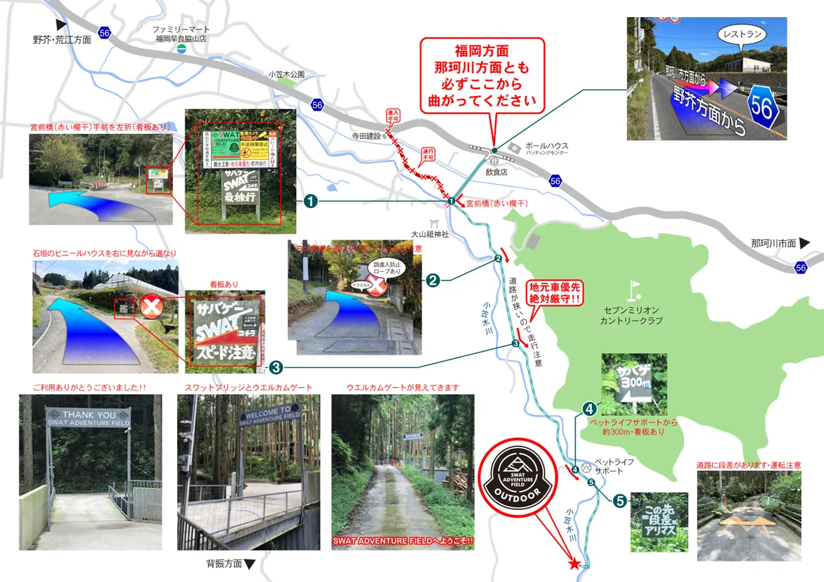 場所は早良区 小笠木・セブンミリオンカントリークラブの近く ・SWAT から車で約 40分程度(約 13km) ・福岡都市高速道路環状線:野芥西料金所より約 30分(約 10km) ・途中目印となる「ペットライフサポート」から約 300m ・県道 56号線からの進入路が限定されております Google ルートマップを参照してください SWATからのルートマップ 出来る限り相乗りでのお越しをお願いします |